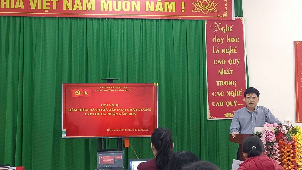 Thực hiện kế hoạch số 37-KH/ĐU ngày 25 tháng 11 năm 2025 Kế hoạch kiểm điểm đánh giá xếp loại chất lượng đối với tập thể, cá nhân trong hệ thống chính trị của xã Đồng Yên và sự chỉ đạo của Đảng ủy xã Đồng Yên. Chiều ngày 3 tháng 11 năm 2025 Chi bộ Trường Mầm non Vĩnh Phúc đã tổ chức đánh giá, xếp loại chất lượng đảng viên năm 2025 theo quy định.
